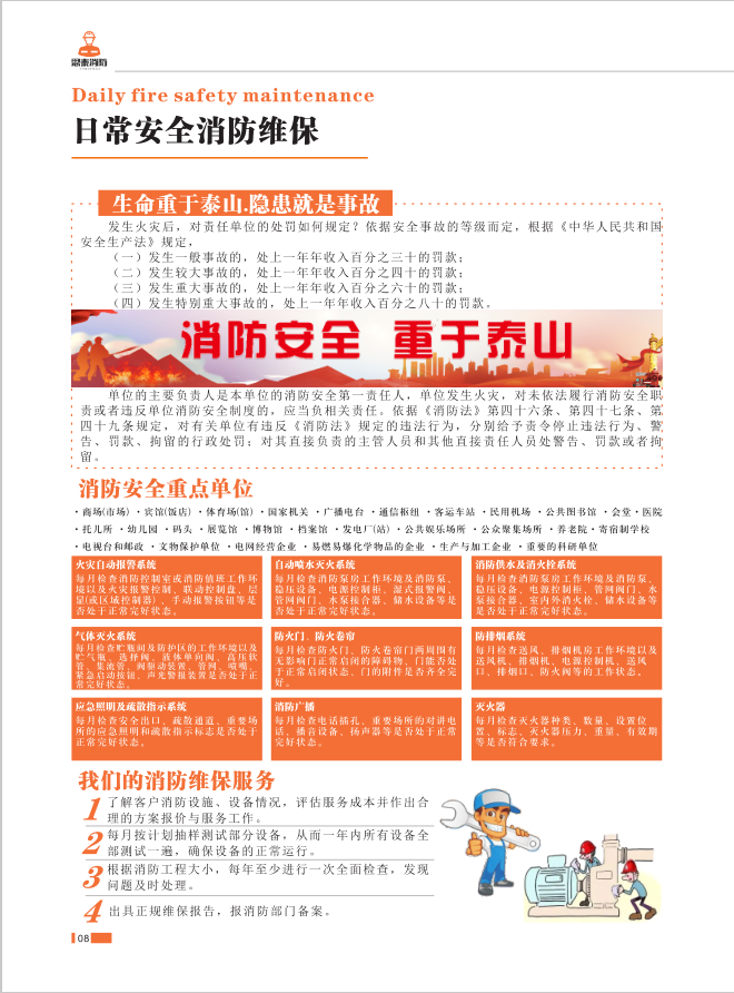 消防系統是每個單位正常生產、工作及生命安全的保證,根據公安部公通字[1996]21號《關于抓緊建立和認真落實建筑消防設施檢查維修保養管理制度的通知》和廣西壯族自治區第143號《廣西消防安全責任監督管理辦法》的指示精神,消防設施必須定期維護、保養,發現故障及時清除,確保消防設施能夠正常運行,發揮其有效的安全預警功能,保障國家財產免受損失和人民群眾的安全。真誠希望通過共同的努力,使其有效地發揮作用。